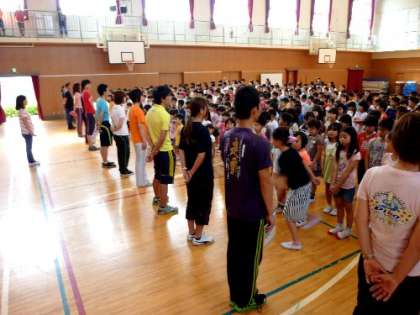 全校朝会では担任の先生が前にたって、係の児童が前にたって挨拶を全員でします。