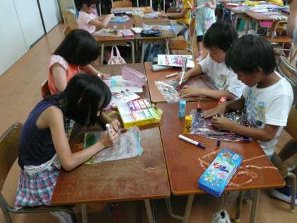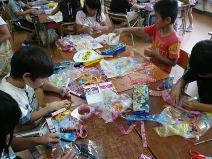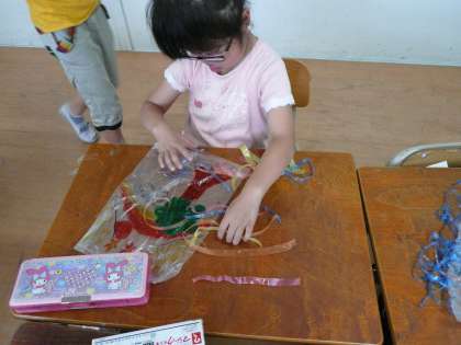 3年生が風の力でうごく作品作りをしています。ビニールに絵を描いて工夫しています。