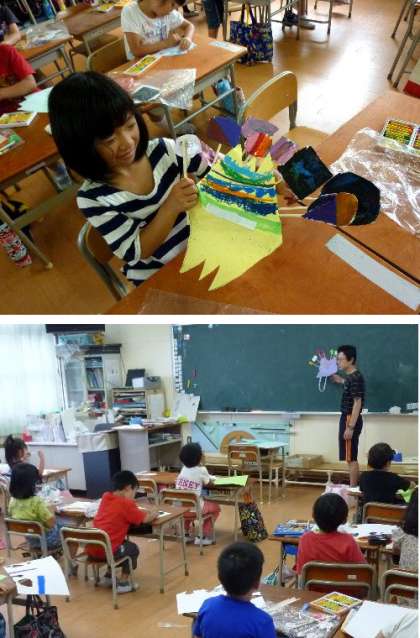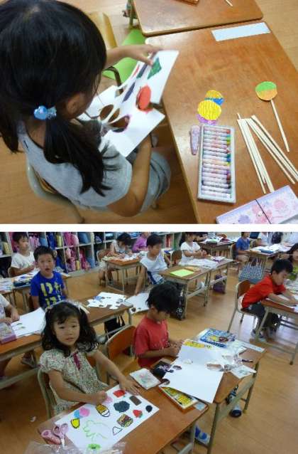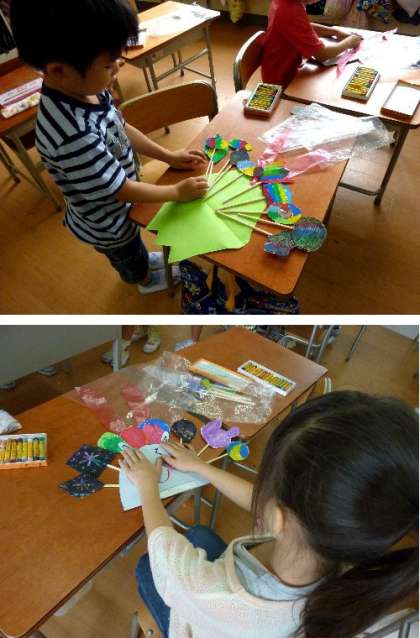 1年生が自分の好きなキャンディーを描いて、割りばしにはりつけて作っています。とってもおいしそうなミックス・キャンディーができあがりそうです。