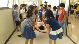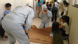 4年生は、毛布と棒で「たんか作り」を体験しました。大人の人も運ぶことができます!