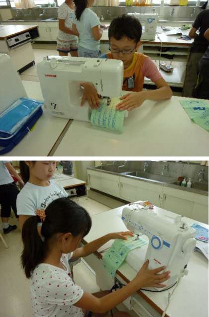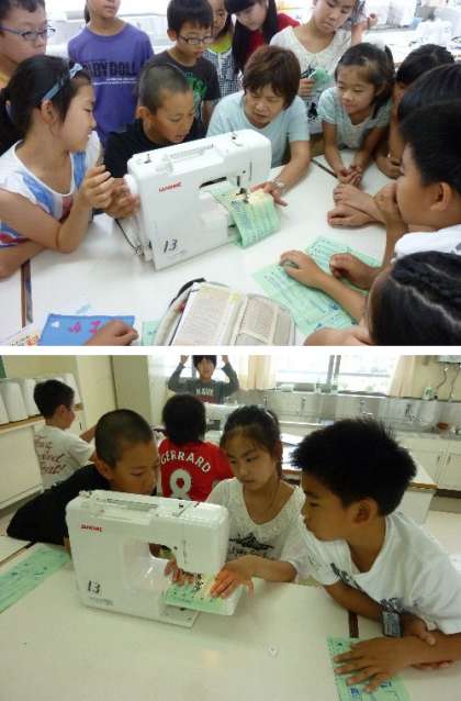 5年生がミシンの練習をしています。糸のかけかたもむずかしいかな。先生に教えてもらって、いざ練習です。なかなかおもいどおりにいかないけど、練習していくうちにコツがわかってくるよね。