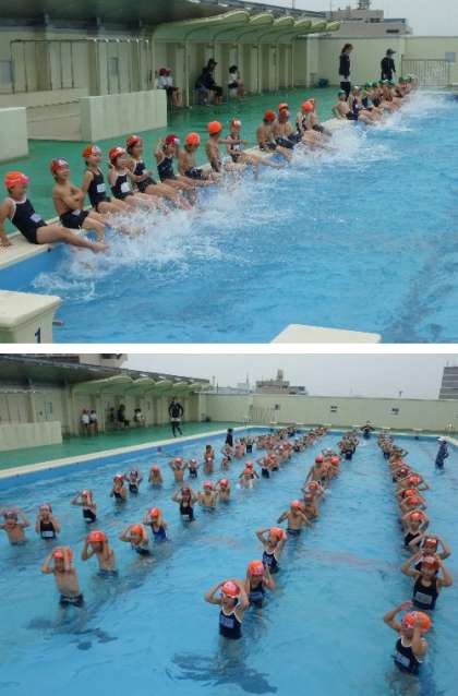 3・4年生がプールで泳いでいます。まずは、昨年の復習からスタート。水にもぐり、ふしうきから始まりました。