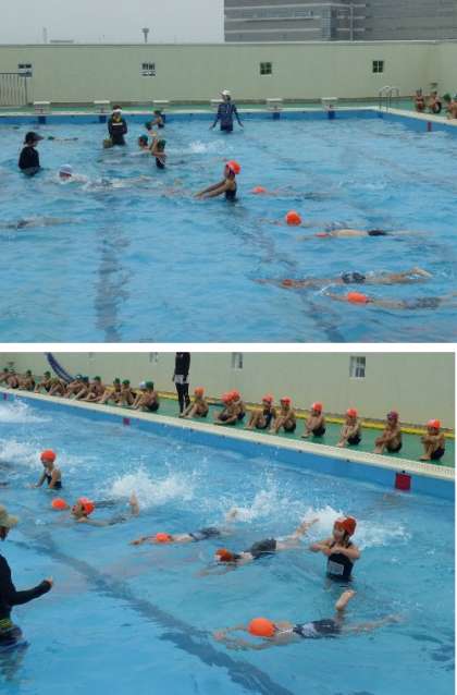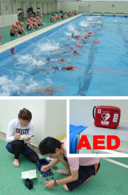 プールの安全のため、たくさんの先生で見守って指導しています。毎日の水質や水温を確認しています。また、今年からプールサイドにはAEDを置いてすぐに対応できるようにしています。