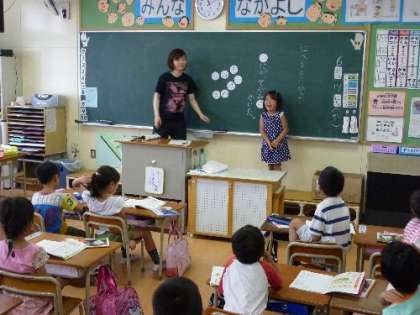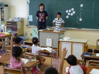1年生が「は」「へ」「を」をつかって、文にいれて作っています。日本語ってむずかしいね。