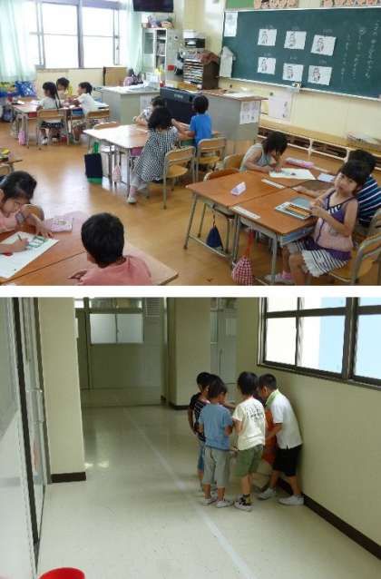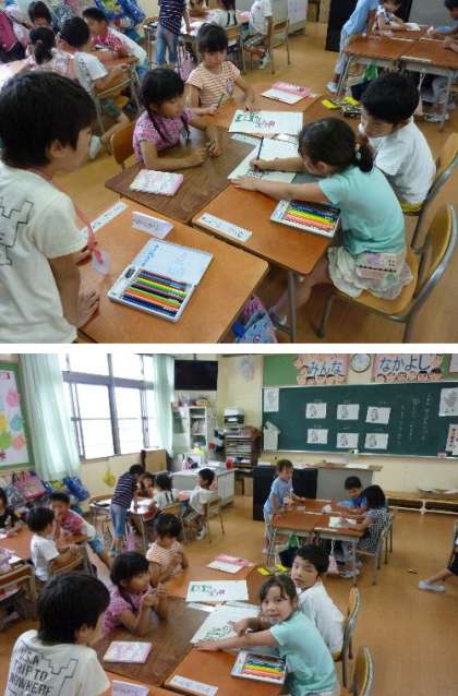 1年生がグループで1枚の絵に色をぬっています。一人がろうかにいる先生から、何色をぬるかを聞いて、グループにしっかり正しく伝えてから、班で色ぬりをします。グループでしっかりと伝えることができましたか。