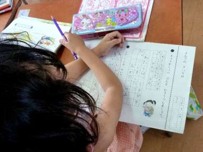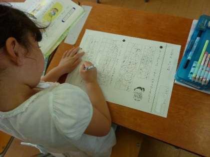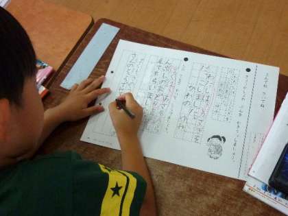 1年生の国語では、句読点や「てにをは」をつけて、ただしい文の書き方を勉強しています。「わたしは、いきいきでうつしえをしました。」「ぼくは、あさそうらんぶしのおどりをおしえてもらいました。」としっかりと書けていますね。