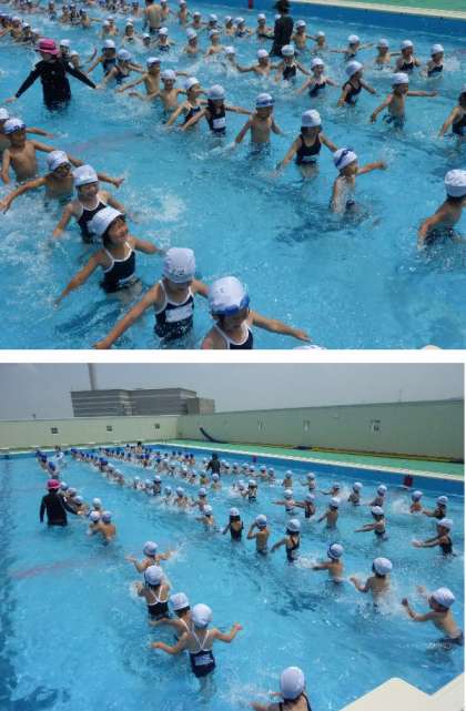 1・2年生のプールは、プールの水深もさげています。まず、1年生は水にしっかりなれましょう。肩までつかってプールの中をすすんでいく。顔をつけて進む。少しずつですね。