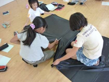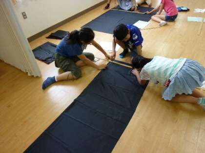長い布地を切るのはむずかしいですね。生地がうすいので、皆で協力してがんばっています。