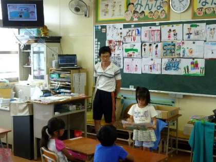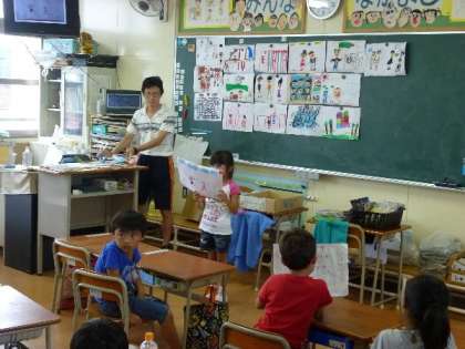 1年生が、自分の描いた絵をみんなに説明するため、はじめての作文を書いて、皆の前で発表しています。その発表を聞いて皆が感想をいってくれていました。だんだんしっかりできるようになってきましたね。がんばろうね。