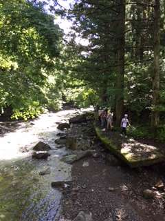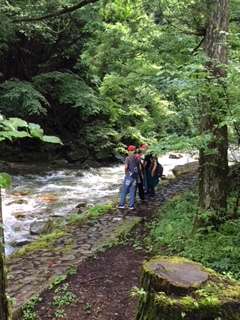 夏の太陽の下、川沿いをグループで協力して歩きました。