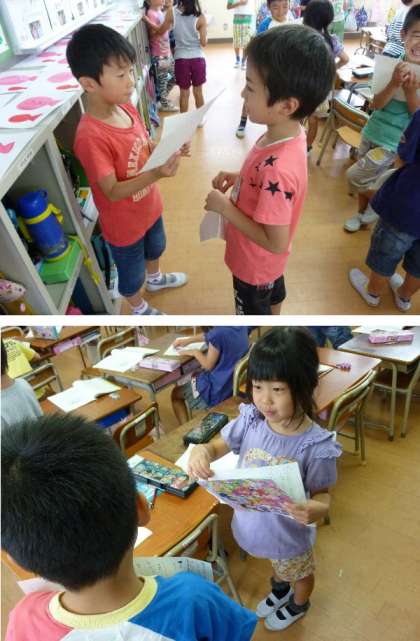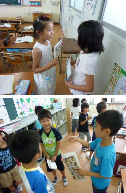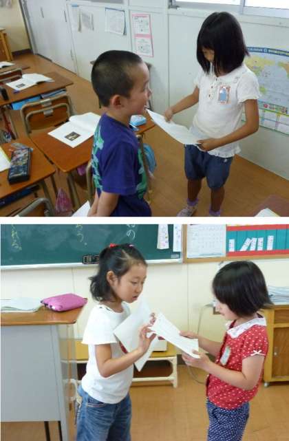 2年生の国語では、「ふろしきはどんなぬの」を学習しています。説明の文章を書いたり、しつもんと答えを書いて、友だちとベアになって、お互いに説明をしたり質問したりしています。楽しそうに友だち学習しています。
