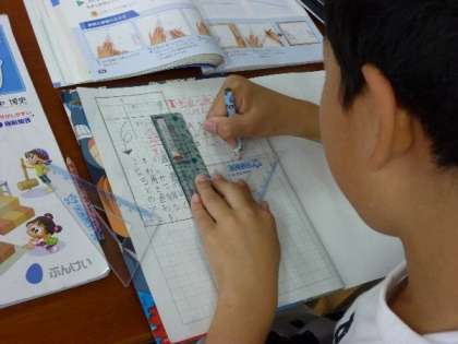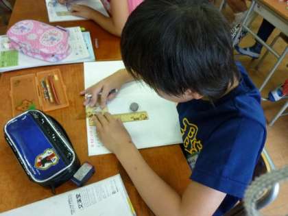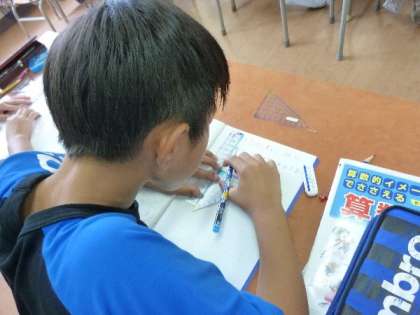4年生は分度器や三角定規をつかって作図をする学習をしています。定規に三角定規をあてて、三角定規をスライドさせて平行な線を書いています。なるほどなるまど。こうして書くと簡単に平行線がかけるんですね。