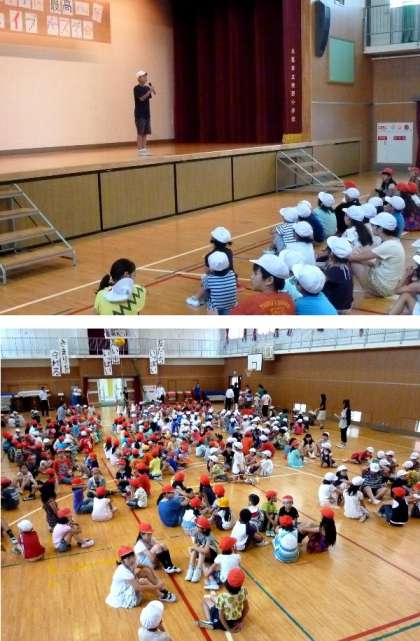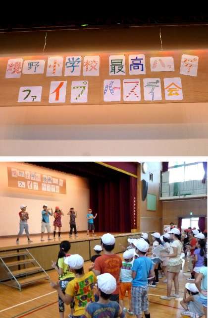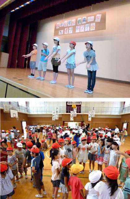 今日は土曜授業です。まず、「焼野小学校 最高ハッピー ファイブバースデー会」を講堂でおこないました。第1部は、児童代表のあいさつと、校長先生からのお話がありました。そして、「誕生日を祝おうよ」ゲームをしました。児童会の歌の最後の言葉文字数でグループを作ります。たのしそうです。