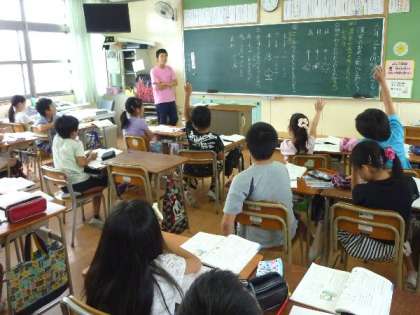 5年生の国語の授業です。漢字のなりたちについて学習しています。元気よく手をあげて答えていますね。