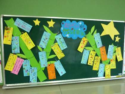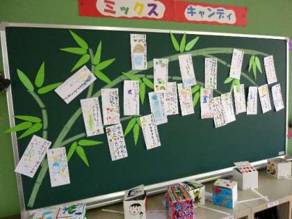 低学年の教室に七夕の掲示がされています。短冊には「さかあがりがふまくなりたいです」「およげるようになりますように」「ピアノがうまくなりたいです」「サッカー選手になりたいです」と書かれた願いがはってあります。