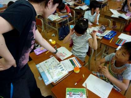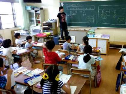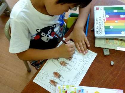 1年生が計算で「6−4=2」を、虫さんやお花の絵を描いて計算して、それをお話しして文を書いています。楽しく算数や国語の勉強をしています。なかなか、みんなの絵も上手だね。