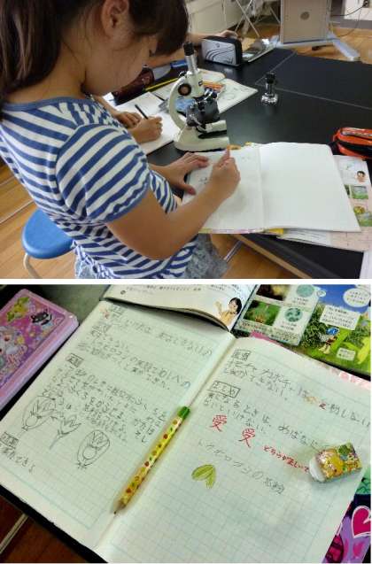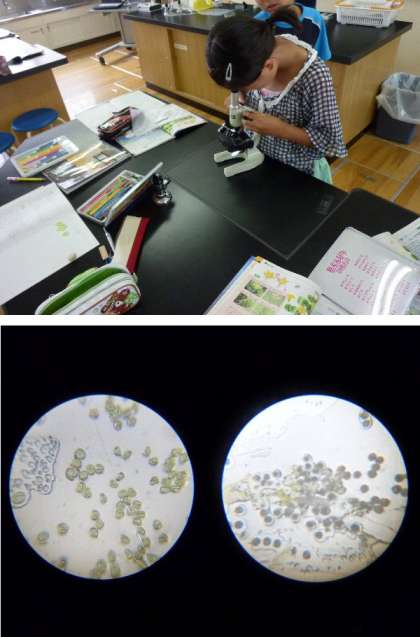 5年生が理科の授業で顕微鏡をのぞきこんでいます。学級花壇に咲いているトウモロコシやひょうたんの花粉をみて、スケッチ観察しています。よくみえますね。