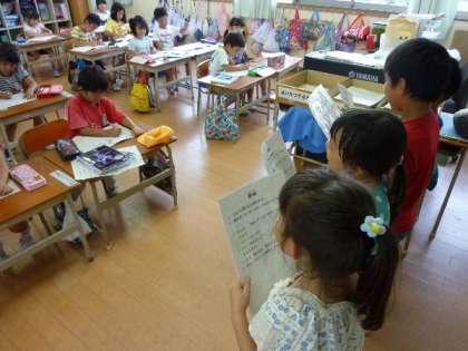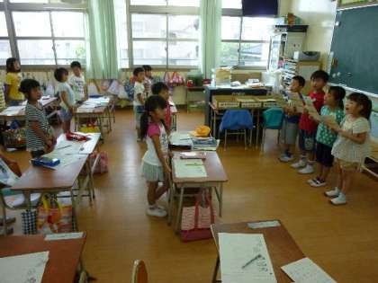 1年生が自分たちだけで朝の会をしています。司会の原稿をみながら、みんなであいさつをしてすすめています。だんだんしっかりとできるようになってきましたね。たのもしいです。