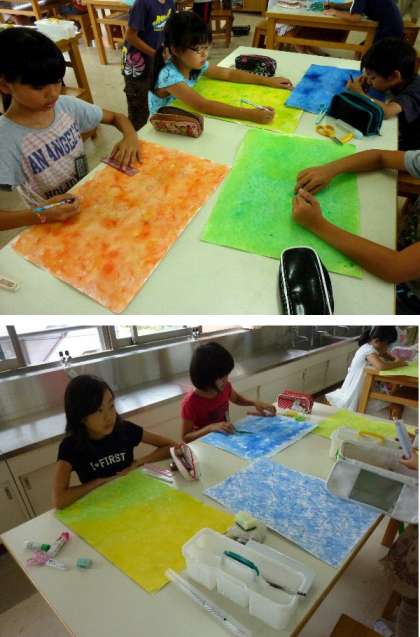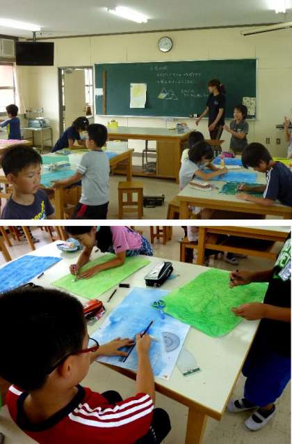 4年生の図工です。三角形を描いて色をぬっています。色ぬりはとなりの三角とちがう色をぬります。