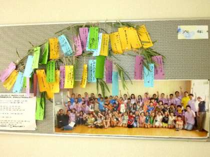 6年生の掲示版には、七夕のササが掲示されました。先日のGEの学習の記念写真も掲示されています。