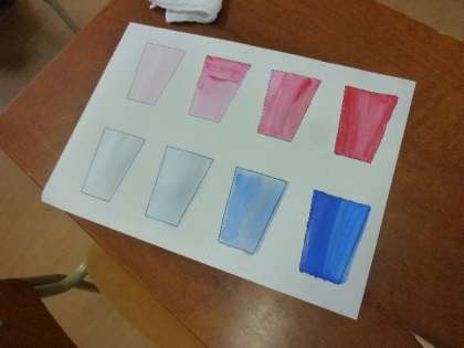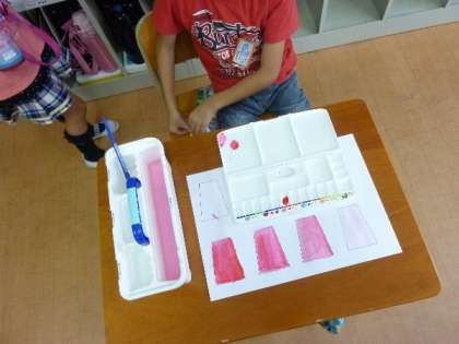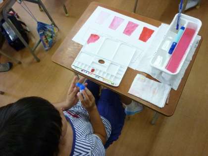 2年生の図工で絵具で色を塗る練習をしています。うすい色からこい色を、筆を使い分けて上手に描いていました。むずかしいけど、よくがんばってますね。