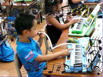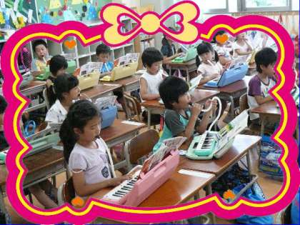 1年生の音楽では、ピアニカをつかってまずは「ドレミ」の練習です。「ドレミ」「ミレド」と練習しているうちに、いつのまにか「ちょうちょ」のメロディになって曲がひけちゃった。口で吹いて、右手で鍵盤弾いて、なかなかむずかしいなあ。