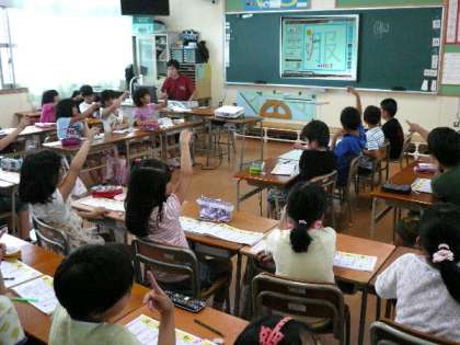 3年生の学級で、パソコンで漢字の筆順を確認し、皆で大きく手でなぞって練習しています。どの学級も漢字の書き方に力をいれています。一文字一文字ていねいに筆順を確認し、ゆっくりとていねいに練習しています。