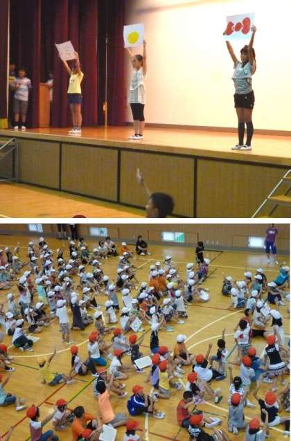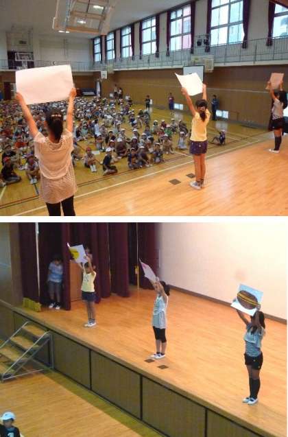 今日の児童集会は、スリーヒントキャラクタークイズです。3つのヒントとなる絵をみて、おなじみのキャラクターをあてます。左右に6本のひげに、赤いりぽん・・・・これは、そうあれです。キティちゃんですね。あれ、どらやきもヒントにあるね。そうそうあのキャラクタですよ。