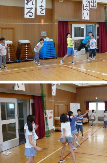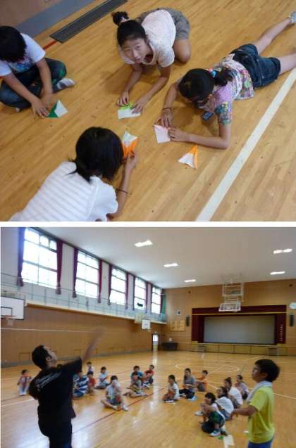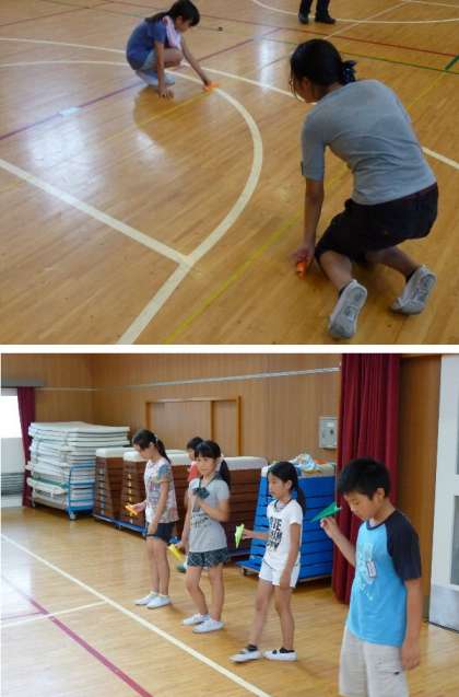6年生が学級での子どもたちの提案で紙飛行機大会を実施しています。折り紙でいろいろと工夫して飛ばして飛距離をきそっています。楽しそうですね。