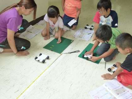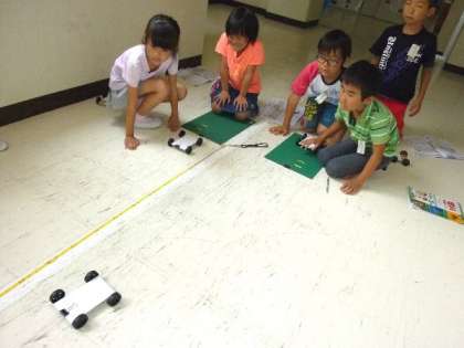 3年生が完成させた車をゴムでうごかしています。ゴムを伸ばす長さで、車がどれだけ走るか距離をはかっています。うまくいったかな。