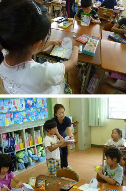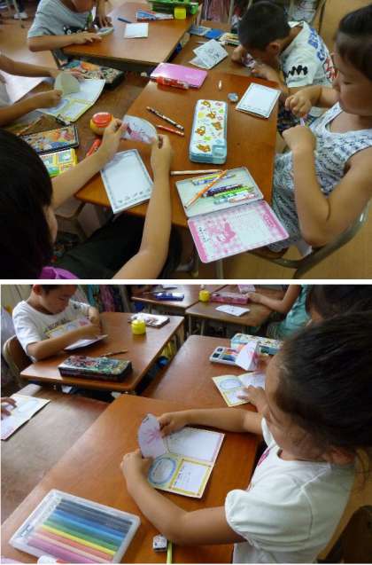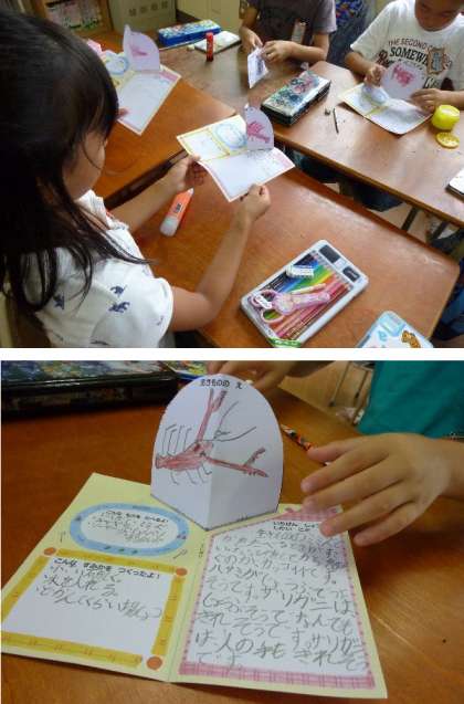2年生が班でかっているザリガニさんの紹介文と絵を書いて、紹介カードを作っています。ザリガニさんにはそれぞれ名前がついています。カードには、「こんなものをたべるよ」「こんなすみかつくったよ」「いちばんしょうかいしたいこと」などが書かれています。そしてなんと、ザリガニの絵は飛び出すようになっています。