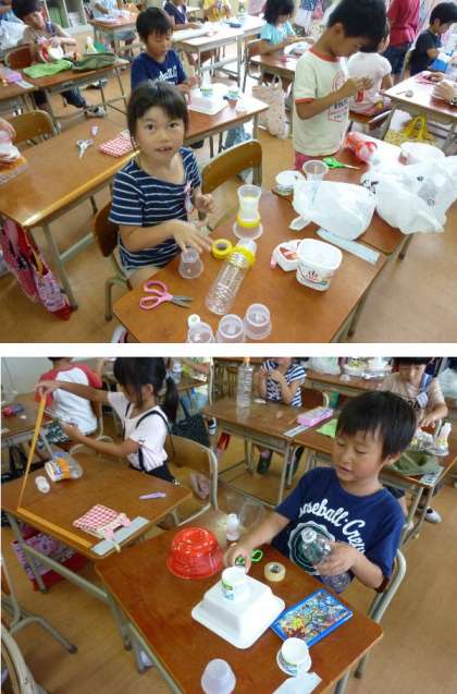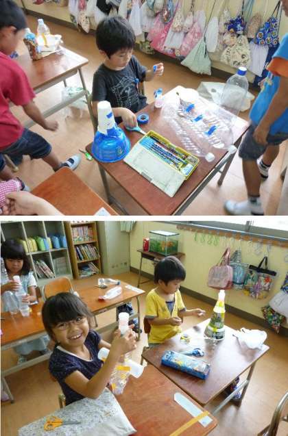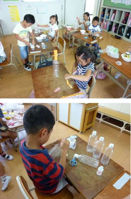 今週で1学期も終わりです。プールで、自分で作ったおもちゃであそびます。ペットボトルとビニールテープで工夫して、いろんなおもちゃを楽しそうに作っています。いろんなおもちゃができそうですね。楽しみです。