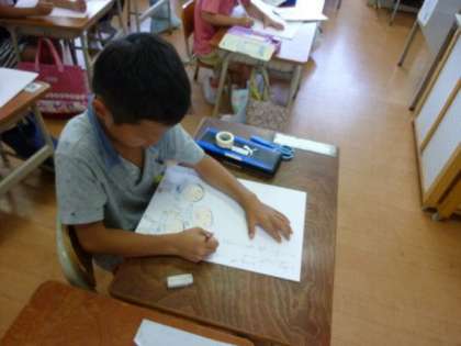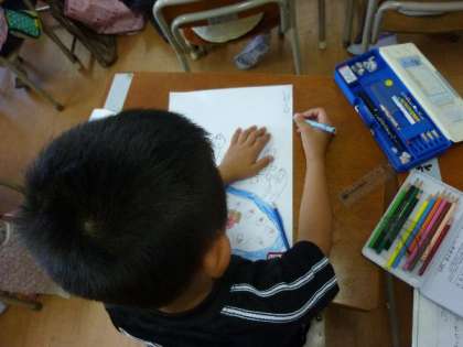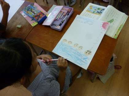 1年生でを書いていました。今日のプールでのあそびをしっかりかけていましたね。