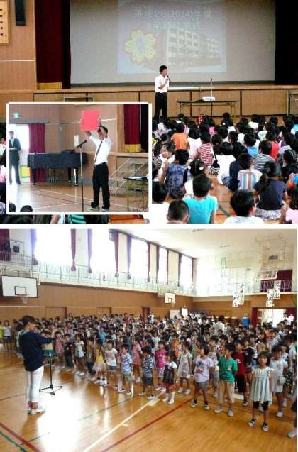今日は1学期末の終業式を講堂でおこないました。校長先生から1学期をふりかえって、プレゼンソフトでたくさんの写真をみました。