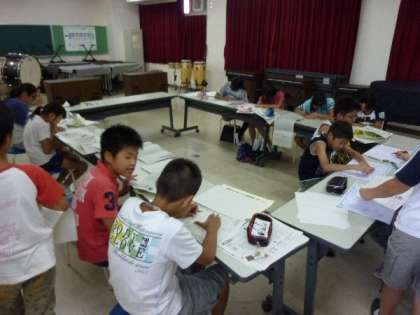 プール開放のあとに6年生が勉強をしていました。お互いに教え合いながら、しっかりと勉強にもがんばっているね。