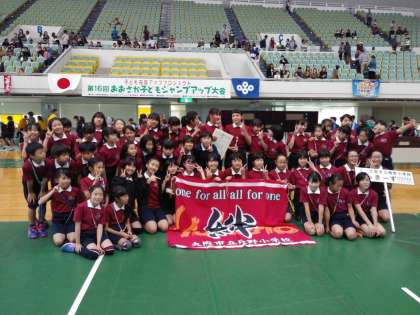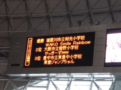 17日土曜日に「おおさか子どもジャンプアップ大会」がありました。焼野小学校『やっき—ず』は、4〜6年生総勢52人で、パフォーマンス部門4連覇をめざし出場しました。約4分間の演技は、選曲から隊形・技の構成まで、全てキャプテンを中心とした6年生が考えました。