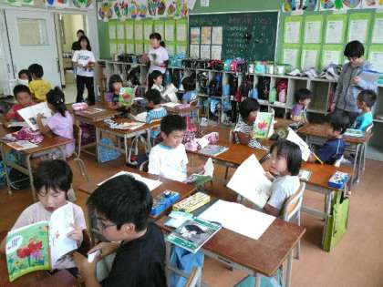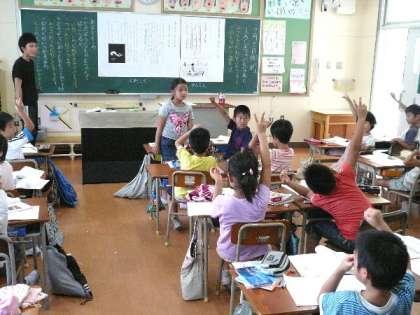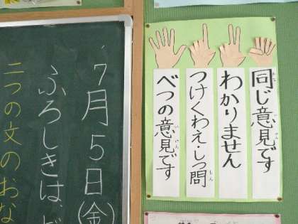 2年2組の国語「ふろしきは どんなぬの」の研究授業です。先生方も見に来ています。ふろしきの説明文とお店の掲示文の同じ文章を探しだしています。ひとりが意見を言ったあと、皆がその意見に対して手をあげてハンドサインで示します。意見を言ったあとに「みなさんどうですか?」と意見を求めて授業がひろがりをみせます。