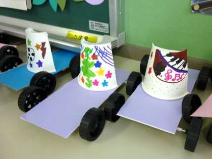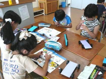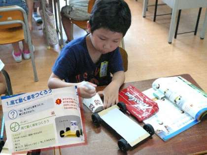 3年生の理科では、風について学習しています。「ほ」をつけた車をつくって風で走らせます。せい作を通して、楽しみながら学習をすすめています。