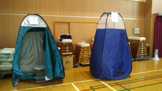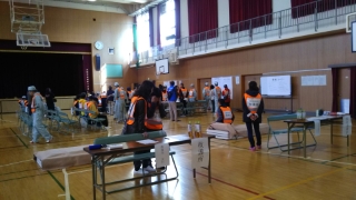 地域の自主防災組織の方々を中心に、災害時に学校が避難所になったと想定した訓練を行いました。体育館に「地域本部」と「避難所運営委員会」を設置し、本番さながらに情報伝達やその対応を行いました。