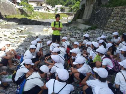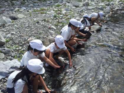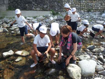 避難訓練のあと、川辺で焼き板磨きをしています。水が冷たくて気持ちいいね。最高です。