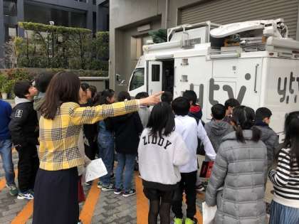 本日、いったいどのようにして番組は作られているのかを知るために読売テレビに行ってきました。子どもたちはスタジオを見学し、スタジオの大きさに驚いていました。生放送が始まる前のスタジオの様子や大道具や小道具がある場所など、普段は入れないところにも見学することができ、目を輝かせながら見たり、メモをとったりしていました。また中継車の説明では、中継車の値段に驚きを隠せなかったみたいです。とても有意義な活動になったと思います。
