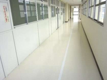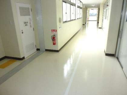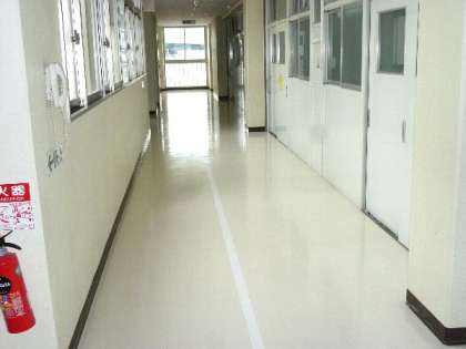 夏休みになって、各階の廊下を管理作業員さんが磨いてワックスをかけていただいています。真っ新の新校舎のようです。開校5年目ですが、気持ちのいい学習環境で毎年スタートできますね。大切に校舎を使っていきましょう。