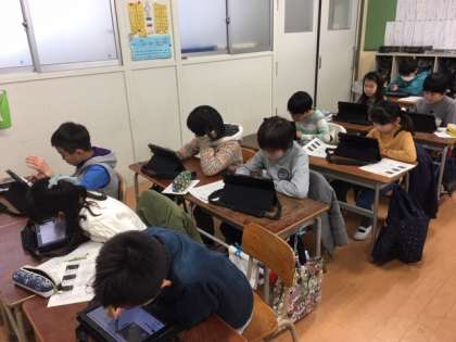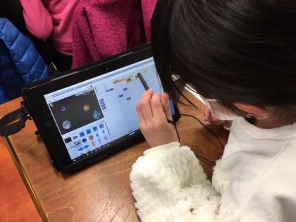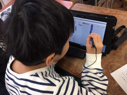 3年生では、プログラミング学習に取り組んでいます。1人1台のタブレットを使い、「Scratch」で学習を進めています。