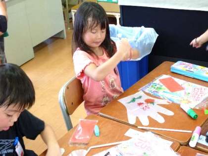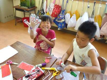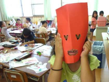 1年生で「ニョキニョキとびだせ!」のセットで、透明手袋にマジックでデザインして、紙で作った仮面と組み合わせた作品づくり。仮面からニョキニョキと手が飛び出す?