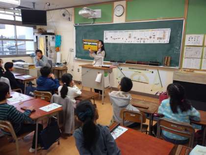3年生が出前授業で「そろばん」を学習しました。初めての児童も多かったのですが、実際にそろばんをはじきながら、計算の考え方を学びました。