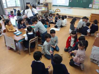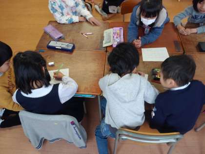 近隣の保育園・幼稚園児による焼野小学校見学会がありました。1年生が教室で迎えて、一緒に遊んだり、一緒にひらがなを書いたり、一緒に本読みをしたりして、保幼小の交流会を行いました。お兄さん、お姉さんに優しくしてもらって、4月から焼野小学校に入学する園児は、希望に胸をふくらませていました。
