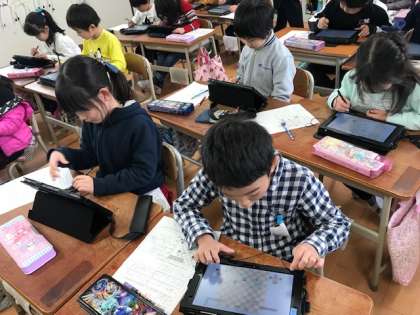 1年生では、プログラミングの学習をしました。キャラクターにどんな指示を出せばいいのかを考えました。「SCRATCH」を使いながら、アルゴリズムを正確に書いたり、友だちに考えたアルゴリズムを伝えたりしました。
