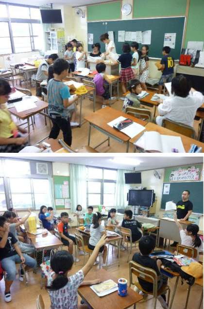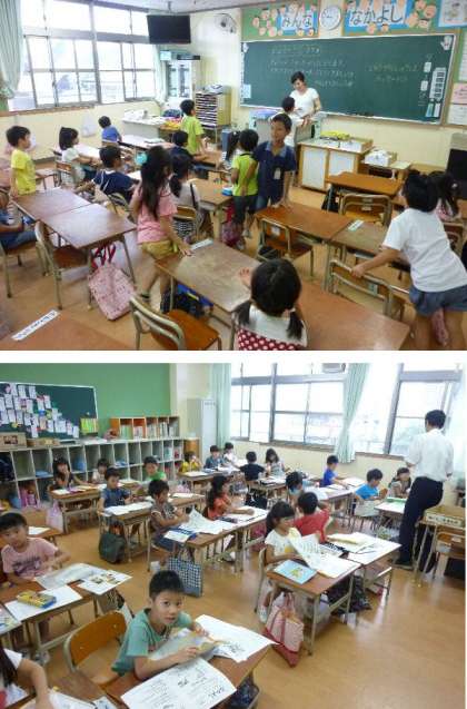 始業式!各学級で宿題を集め、作品もたくさんあるね。