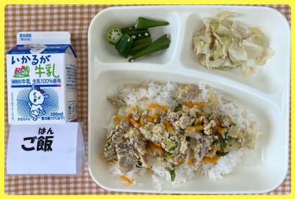 ?今日の献立は、他人丼・ささみとキャベツのいためもの・オクラの甘酢あえ・牛乳でした。