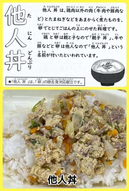 「他人井(どんぶり)」は、牛肉とたまねぎなどの野菜を甘辛く煮て、青みに青ねぎを加え、卵でとじた具をごはんにかけます。この献立は、卵の除去食に対応しています。